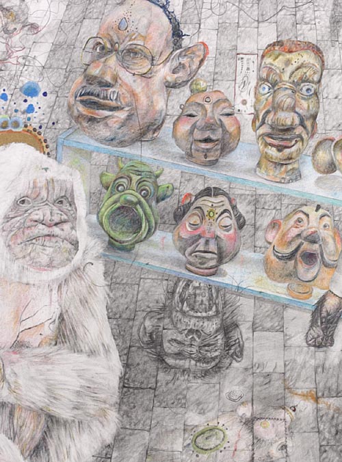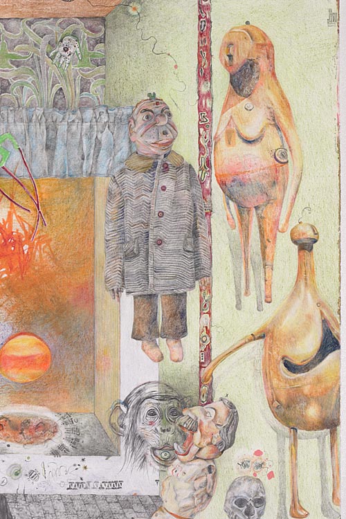 creators main gallery main page sitemap creators IV: puppeteer, puppet maker with albino gorilla2001 color pencil, graphite and acrylic on paper 77 x 57 cm |